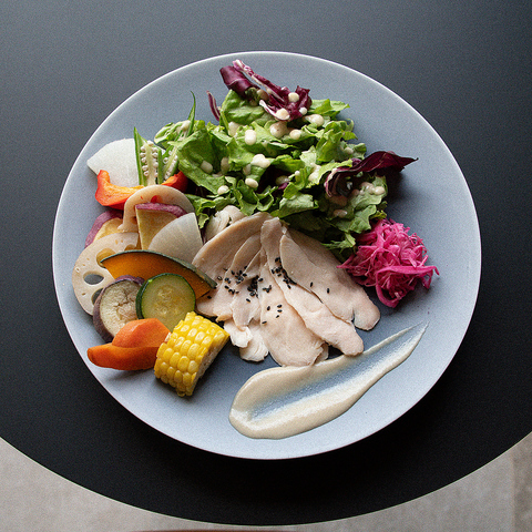 [ しっとりやわらかく、素材の旨みを堪能する一皿 ]・低温調理の鶏むね肉・旬の蒸し野菜・自家製バーニャカウダソース・契約農家直送 オーガニックサラダ・淡路島産玉ねぎドレッシング・紫キャベツのピクルス