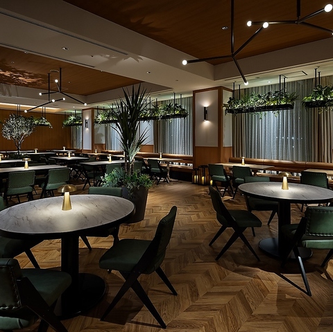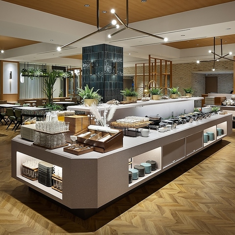 広いビュッフェ台に天井の高い店内、ボタニカルな雰囲気の落ちついた店内が魅力♪