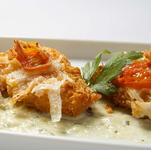 白身魚のフライに特製のホワイトバジルクリームソースをかけた逸品