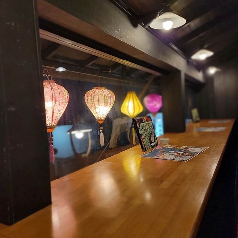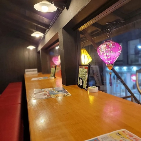 2Fにはカウンター席もございます。お一人様でもリラックスした雰囲気でお食事をお楽しみいただけます。ご友人同士やデートの会話を楽しむのにも最適なスペースです。