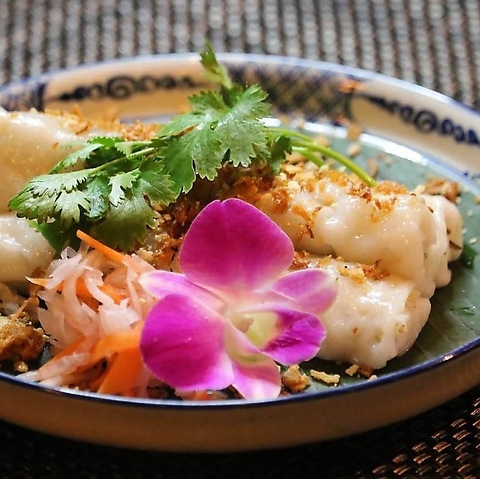 ベトナム中部の名物料理で、米粉を主成分とした蒸し料理です。小さな器に入れられたこの料理は、もちもちとした食感が特徴で、中には様々な具材が詰まっています。上に香草がトッピングされ、風味豊かなタレをかけていただくことで、さらに美味しさが引き立ちます。