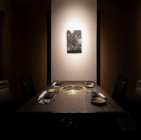 【全席完全個室】極上の空間で楽しむ贅沢なひととき!お客様に心ゆくまでリラックスしてお食事を楽しんでいただけるよう、店内は全室完全個室でご用意。4名様、6名様など少人数個室、お部屋を繋げて最大20名様までの貸切にも対応可能。黒を基調としたシックで落ち着いた空間は、様々なシーンでご利用いただけます。