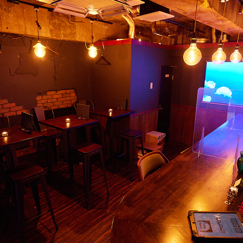 【インテリアを眺めるカウンター】可愛い雑貨や夏はアクアリウム、冬は焚き火を眺めながら楽しめるカウンター席が大人気♪落ち着いた雰囲気なので、お一人様はもちろんデートなどにもぴったりです◎三宮でお店を探すなら是非!夜カフェ・ショットバー!