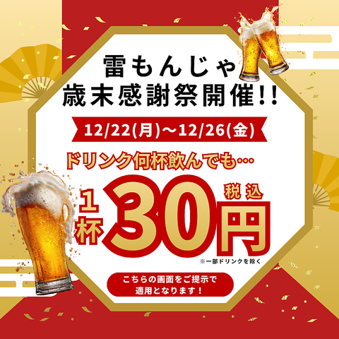 当店ではご来店いただきました皆様への1年間の感謝を込めまして、歳末感謝祭を開催いたします!なんと…店内ドリンクが何杯飲んでも【1杯30円(税込)】※ご来店時にこちらの画面提示が必須となります※対象ドリンクは一部ドリンクを除くドリンクメニューとなります※他クーポン・サービスとの併用不可となります
