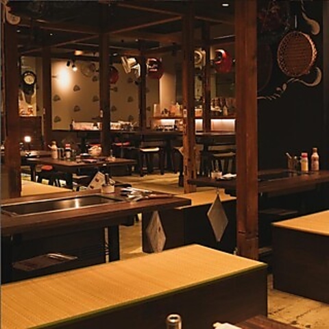 【昭和レトロな雰囲気で落ち着く空間】店内は木のぬくもりに包まれ提灯が灯る、レトロ空間。どの席にも鉄板を完備しているので、みんなでワイワイ楽しめます。浅草らしい雰囲気で、観光にもぴったりです