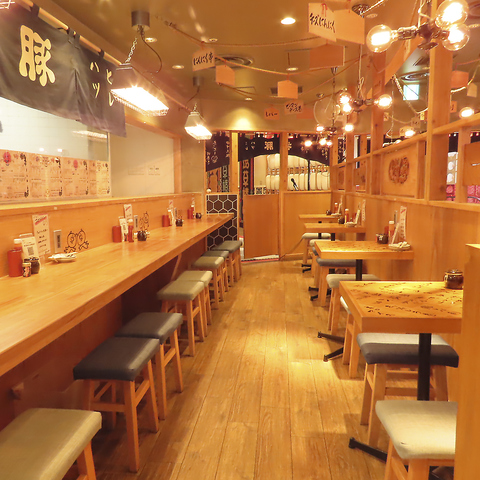 店内は木を基調とした、温もり溢れる空間が広がっています。店内に足を踏み入れると、料理名が書かれた装飾品やテーブル、壁に描かれた当店のマスコットキャラクターに目を奪われます♪カウンター席、テーブル席をそれぞれご用意しておりますので、少人数~大人数(60名様程度)までご利用頂けます♪