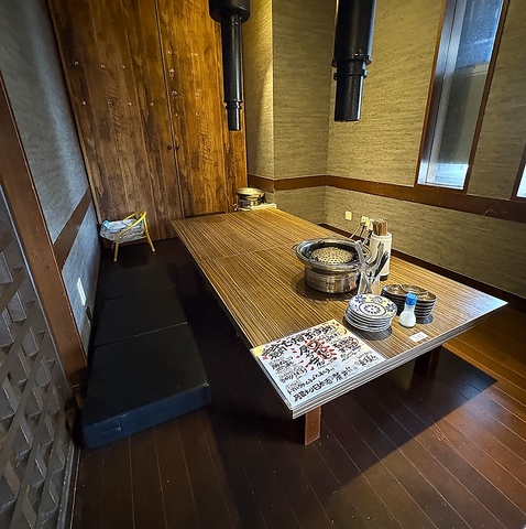 小上がり席(6ー8名) 完全対応!お子様も大歓迎。畳のくつろぎ空間に囲まれて、ご家族や仲間とゆったり焼肉を楽しめます。お子様用チェア・キッズメニューのご用意もあり、鉄板の熱さにも配慮。赤ちゃん連れでも安心の座敷席です