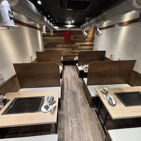鉄板を囲んで焼きながら楽しむテーブル席。食事も会話も弾む、人気のスタイルです。