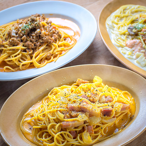 オイル・トマト・クリーム・ジェノベーゼ4種類のソースよりお選びください/(スープ・前菜盛り合わせ・海鮮パスタ・ドリンク・本日のケーキ)/(+220円(税込)でパスタの大盛りできます)