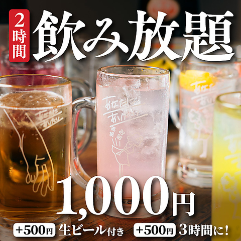 【飲み放題】単品飲み放題2時間1,000円!+500円で生ビール付、さらに+500円で3時間に!