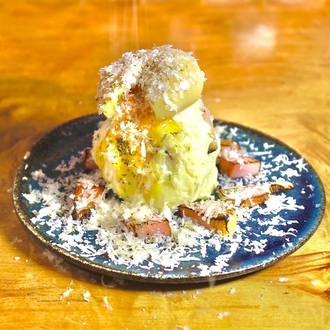黄身の大滝に純白のチーズが降り注ぐ。雪原にそびえる香り高い炙りベーコンをお楽しみあれ。