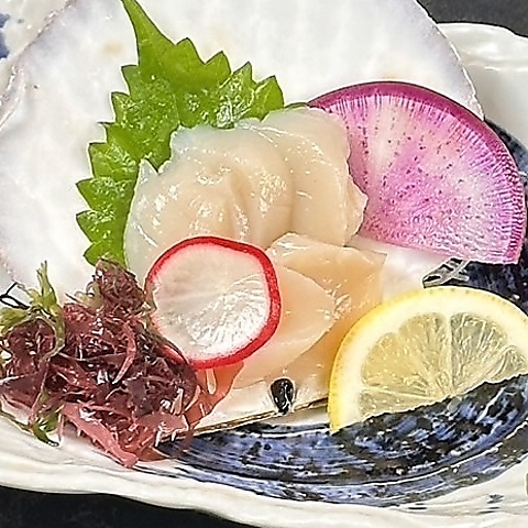 剥きたての新鮮なホタテを使用したお刺身は、ぷりっとした弾力と上品な甘みが格別。水揚げ直後ならではの透明感とみずみずしさが味わえ、一口ごとに広がる旨味が魅力です。わさび醤油はもちろん、柚子や塩で素材の味を引き立てるのもおすすめです。
