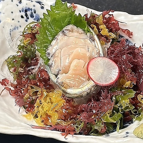 新鮮な活〆あわびを贅沢に使用したお刺身は、コリコリとした歯ごたえと上品な磯の香りが特徴。噛むほどに広がる旨味とほのかな甘みが絶妙で、日本酒との相性も抜群です。肝を添えればさらに深い味わいが楽しめる、特別感あふれる逸品です。