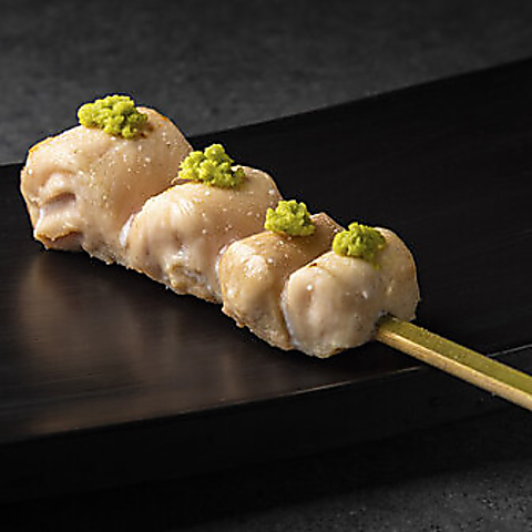 ふっくらと柔らかく仕上げた手打ちのささみ串は、淡白ながらもしっとりとした食感と繊細な旨味が楽しめる一本。丁寧に焼き上げることでパサつかず、わさびや梅、柚子胡椒などとの相性も抜群。ヘルシー志向の方にも人気の、上品な味わいが光る串焼きです。