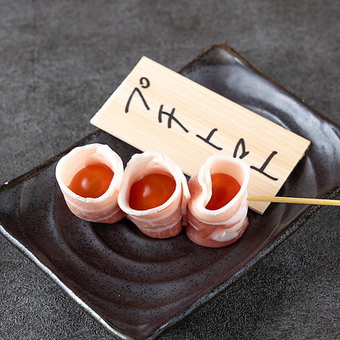 ジューシーなプチトマトを豚バラで巻き、炭火で香ばしく焼き上げた一串。トマトの甘酸っぱい果汁が熱々で弾け、豚肉の旨味と絶妙に絡み合います。ひと口で広がる甘みと酸味、香ばしさがクセになる、見た目もかわいらしい人気の創作串です。さっぱり系のお酒とも好相性。