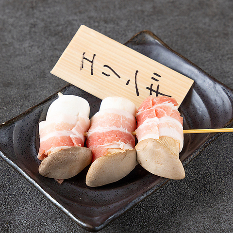 肉厚なエリンギを豚バラで巻き、炭火でじっくり香ばしく焼き上げたエリンギ巻き串。コリっとしたエリンギの食感と、豚肉のジューシーな旨味が絶妙に絡み合い、噛むごとに広がる風味がたまらない一串です。塩やタレのほか、柚子胡椒や七味を添えても美味しくいただけます。