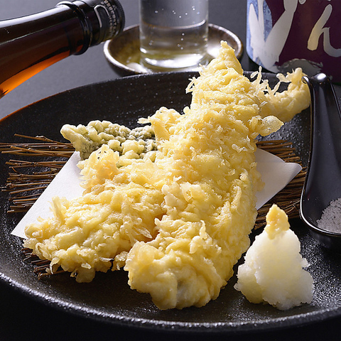 ホタテ・大海老・タコ・穴子・銀たら等、新鮮な旬の鮮魚を贅沢に使い、サクッと軽やかな衣で包んで揚げた極上の天ぷら。魚のふんわりとした食感とジューシーな旨味が絶妙で、揚げたての香ばしさが口いっぱいに広がります。天つゆや抹茶塩で味わえば、素材の良さがさらに引き立つ贅沢な一品です。