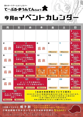 当店では毎日楽しいイベントを開催中♪嬉しい特典や、いつ来ても飽きないのが『てーぶる・まうんてん』の魅力の一つ!!1人で来ても他のお客様や当店スタッフが楽しませてくれること間違いなし☆