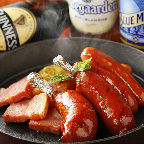 パリッとジューシー!ビールがすすむソーセージ盛り。熱々のうちにどうぞ。おつまみにぴったりの一皿です。