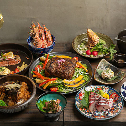和の旨味を詰め込んだ全8品。宝豚ローストやレア刺しなど、多様な味わいを飲み放題と共に堪能できます。