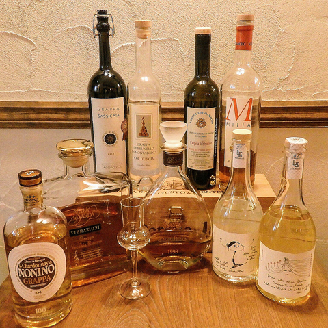 ボトルワインはトスカーナ州を中心にイタリア産のものを200種類以上、グラスワインもスパークリング、白、オレンジ、ロゼ、赤を常時15種類以上揃え気軽に楽しんでいただけるように様々な飲み方のご提案をしております。地味で滋味深い骨太な料理とイタリア全土の土着品種を堪能できるワインをお楽しみ下さいませ。