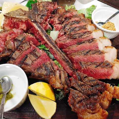 フィレンツェの名物料理のTボーンステーキです。愛知県豊橋市西村牧場「豊橋牛」を使用しています。赤身の強い肉でありながら脂身も美味しく「噛めば噛むほどビステッカ」というフィレンツェ人のいう通りの美味しいお肉です。豪快に1人辺り250gでどうぞ!