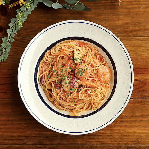 Spaghetti all’arrabbiata with shrimp and bamboo shoot