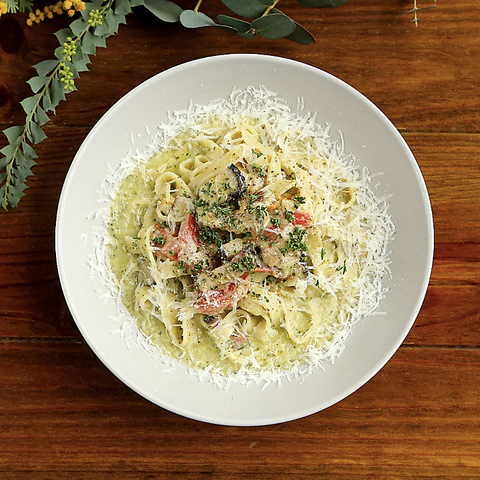 バジルソース,アサリのガーリックソテー,フレッシュトマト,リコッタ,グラナパダーノ, EVOオイル basil, garlic sauteed clams, fresh tomatoes, ricotta, grana padano, olive oil
