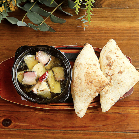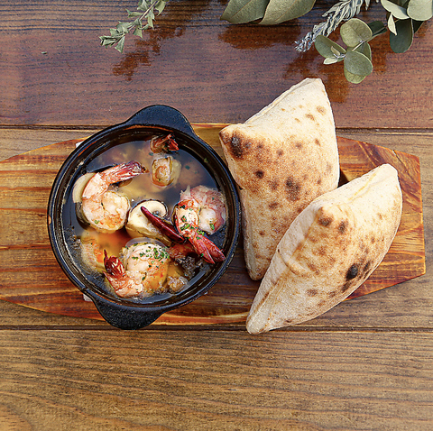 Shrimp and mushroom in spanish-style garlic sauce with pane