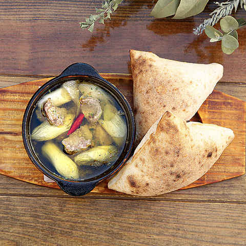 Chicken gizzard and green onion in spanish-style garlic sauce with pane