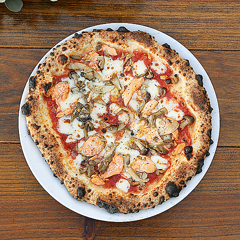 トマトソース、モッツァレラ、サーモン、木の子、オレガノ、グラナパダーノ、EVOオイル:tomato sauce、mozzarella、salmon、mushroom、oregano、grana padano、olive oil