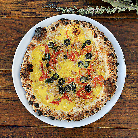 サフランソース、チーズなし、ツナ、フレッシュトマト、オリーブ、ケッパー、バジル、グラナパダーノ、EVOオイル:mozzarella、saffron sauce、tuna、fresh tomatoes、olive、caper、grana padano、olive oil