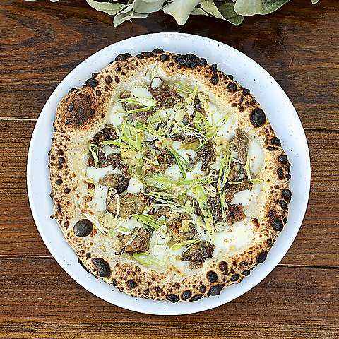 モッツァレラ、牛すじのハーブ煮、長ネギ、レフォール、ガーリックオイル、マヨネーズ、グラナパダーノ、EVOオイル:mozzarella、stewed herbs beef tendon、green onion、raifort、garlic oil、mayonnaise、grana padano、olive oil