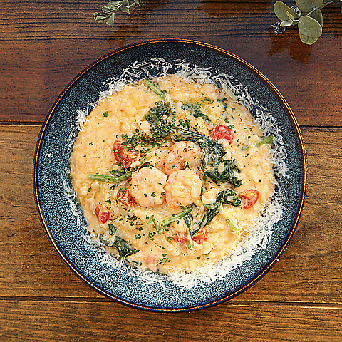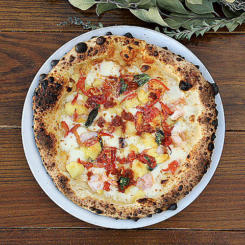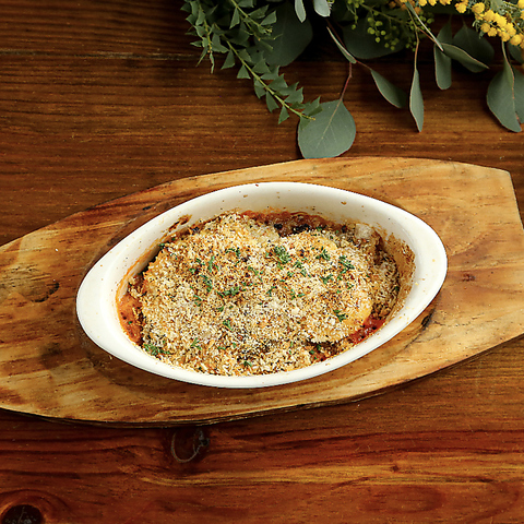モッツァレラ、エビ、アメリケーヌソース、バジル、フレッシュトマト、マッシュポテト、グラナパダーノ、EVOオイル:mozzarella、shrimp、americaine sauce、basil、fれsh tomatoes、mashed potatoes、grana padano、olive oil