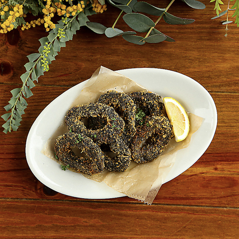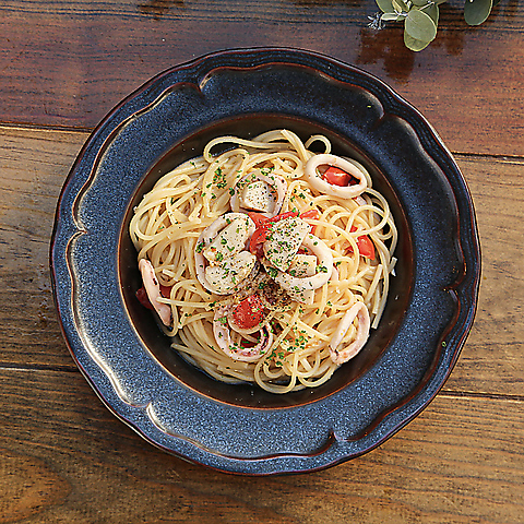 トマトソース,モッツァレラ,イカソテー,イカ墨ソース,ガーリックオイル,バジル,グラナパダーノ, EVOオイル tomato sauce, mozzarella, sauteed squid, squid ink sauce, garlic oil, basil, grana padano, olive oil