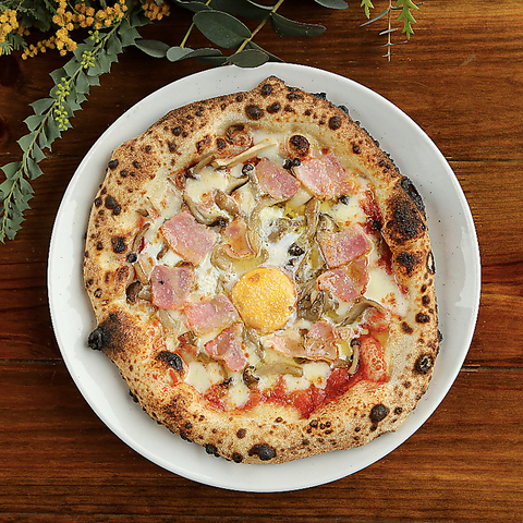 トマトソース,モッツァレラ,ベーコン,木の子,タマゴ,グラナパダーノ,EVOオイル tomato sauce, mozzarella, bacon, mushroom, egg, grana padano, olive oil