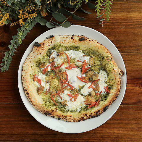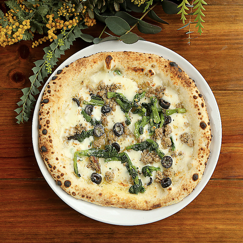 モッツァレラ, サルシッチャ, オリーブ, ブラックペッパー, 菜の花, ガーリックオイル, グラナパダーノ、EVOオイル:mozzarella, salsiccia, olive, black pepper, canola flowers, black pepper, grana padano、olive oil