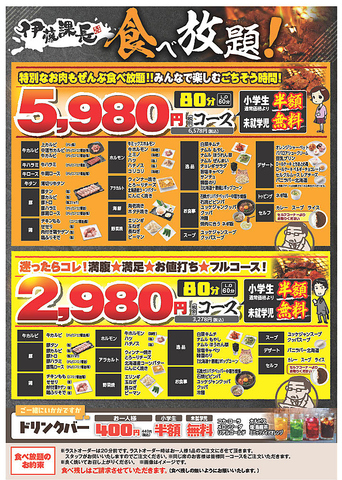 食べ放題牛カルビ付きが税込3,278円~!!別でデザート食べ放題付コースもご用!意!!