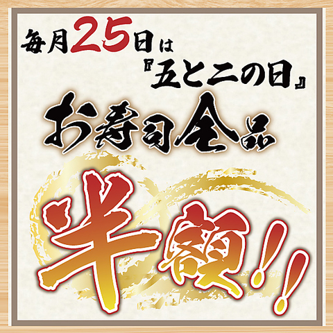 毎月25日は自慢のお寿司がなんと半額で食べれます☆五と二の日は是非、鮨食人五と二へ!!