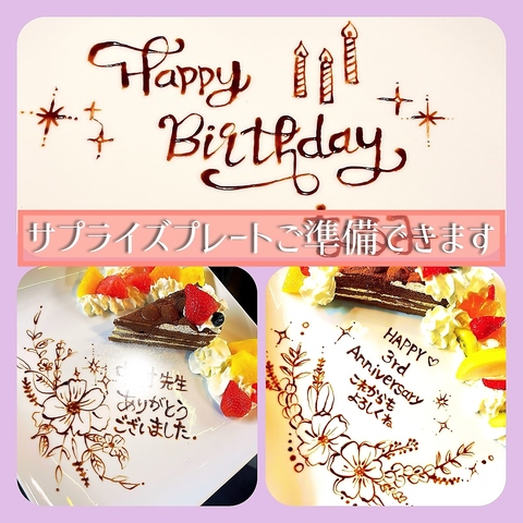 ※前日までの要予約※1650円(税込)誕生日、記念日などのサプライズはお任せください☆メッセージ付きのプレートを『コースご予約のお客様に限り』サービス致します♪書いてほしい内容や用途など、遠慮なくご相談くださいませ☆