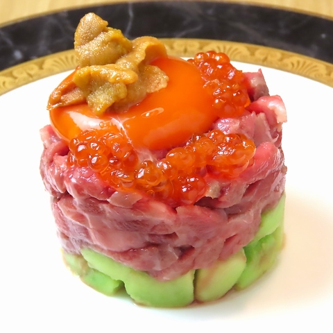 豪華な食材を贅沢に使用したこの一品は、視覚でも楽しめる芸術的な盛り付けが魅力です。新鮮な牛タンの上には、ウニとイクラが華やかに彩り、写真映えも抜群。思わずシャッターを切りたくなる見栄え。食材の旨味が口の中で広がり、至福のひとときをご提供いたします。特別な日には、ぜひご利用ください。