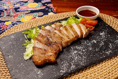 沖縄はもっと美味しい!をテーマにしています。キビまる豚のロースステーキ。沖縄の大人気ブランド豚「キビまる豚」のステーキ。脂の甘いキビまる豚をじっくり低温調理して焼き上げます。