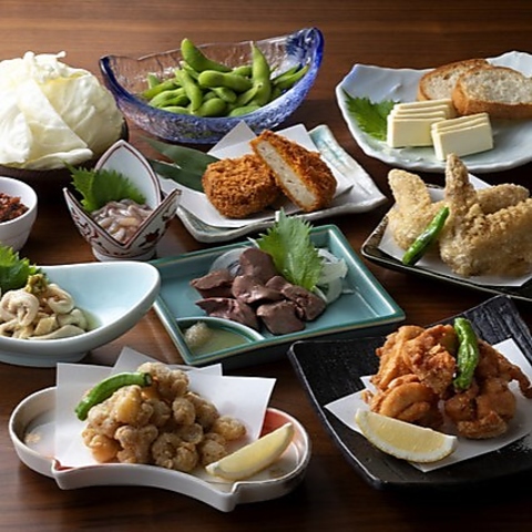愛知のブランド鶏三河鶏を心ゆくまで堪能できる全10品のコースです。自慢の串焼きや、ジューシーなもも肉と冬野菜の陶板など、一品料理が充実。人気の手羽先唐揚げは2種をご用意し、〆はかき玉きしめんで、ボリューム満点の内容となっております。※+1,500円(税込)で飲み放題(2時間)