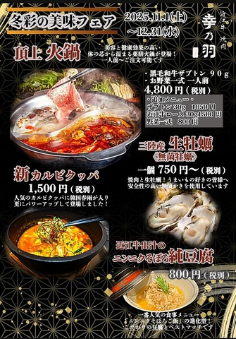 美容と健康効果の高い体の芯から温まる薬膳火鍋が登場!一人前~ご注文可能です。■頂上 火鍋:5280円(税込) ■新カルビクッパ:1650円(税込) ■三陸産 生牡蠣《無菌牡蠣》:一個825円(税込)~ ■近江牛出汁のニンニクそぼろ純豆腐:880円(税込) ぜひこの機会にお試しくださいませ。