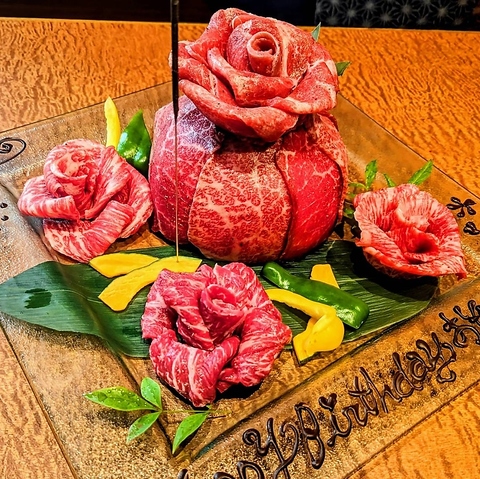 大切な人との記念日に近江牛の肉ケーキでお祝いはいかがでしょうか。■旬の先付け三種/幸乃羽サラダ/幸乃羽の肉寿司/海老餡の玉地蒸し/近江牛肉ケーキ(上タン塩、ザブトンの焼きすき、イチボの焼きしゃぶ、近江牛特撰カルビ、彩り焼き野菜)/白米、牛骨出汁の若芽スープ/デザート ★肉ケーキを花火でプレゼンいたします!