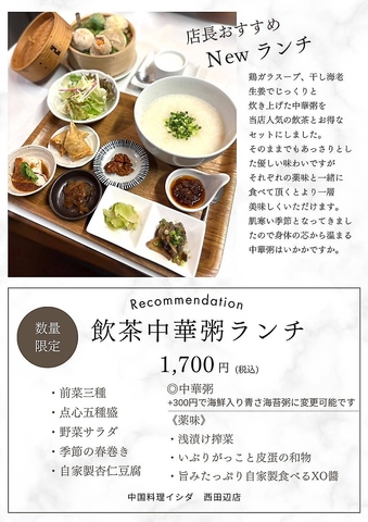 鶏ガラスープ、干し海老生姜でじっくりと炊き上げた中華粥を当店人気の飲茶とお得なセットにしました。そのままでもあっさりとした優しい味わいですがそれぞれの薬味と一緒に食べて頂くとより一層美味しくいただけます。肌寒い季節となってきましたので身体の芯から温まる中華粥はいかかですか。