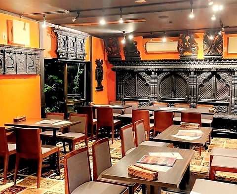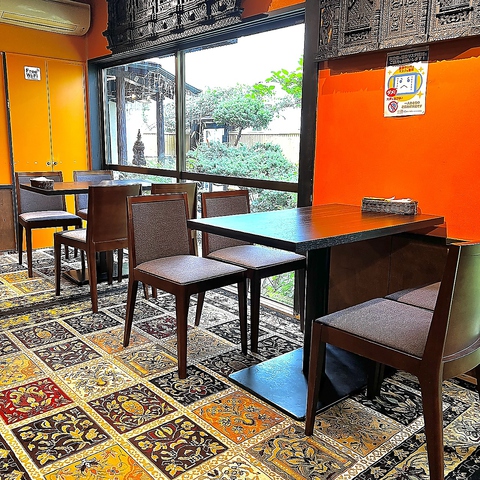 異国情緒と懐かしさあるアジアの古い彫刻が飾られ、庭園も眺める落ち着いた雰囲気のお席。店内は土足厳禁。全面カーペットが敷かれていて、靴を脱いでおくつろぎください。