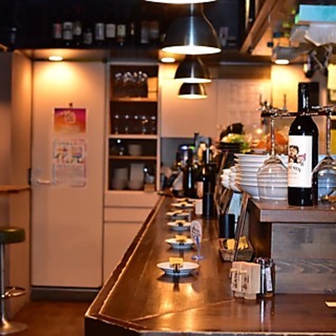【カウンター席:10名様】JR恵比寿駅から徒歩7分。木を基調にしたノスタルジックな店内には、ワインボトルが並び、オシャレで大人な雰囲気。カウンター席はお一人様やデートに好評いただいております。お仕事帰りのチョイ飲みにも◎