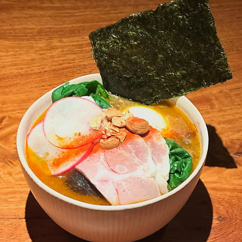 ※内容はその日のおすすめとなります。デフォルトのトッピングは国産豚ロースハムとほうれん草です。たっぷりの香味野菜と10種類以上のスパイスからつくる特製カレーペースト。国産食材にこだわり、豚や鶏、魚介、昆布などの旨味を引き出したスープで無添加無化調でつくります。身体にも優しい一期一会のスープカレー。