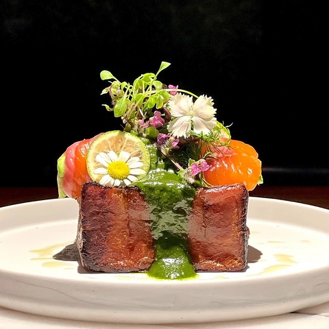 ハーブ食塩飽和水に1週間ほど漬け込んだ国産豚かたロース。低温で優しく火入れをしました。香ばしく炙り醤油だれを絡めてご提供いたします。中心ににトッピングされたしもきた半熟卵に八丁味噌ソースがさらに贅沢感を増します。